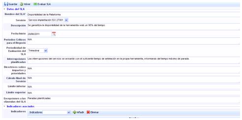 La tabla inicial muestra los diferentes SLA’s definidos por la organización, especificando entre otros campos, la fecha desde la cual se está prestando, el servicio al que están asociados, una breve descripción del mismo y las evaluaciones.
