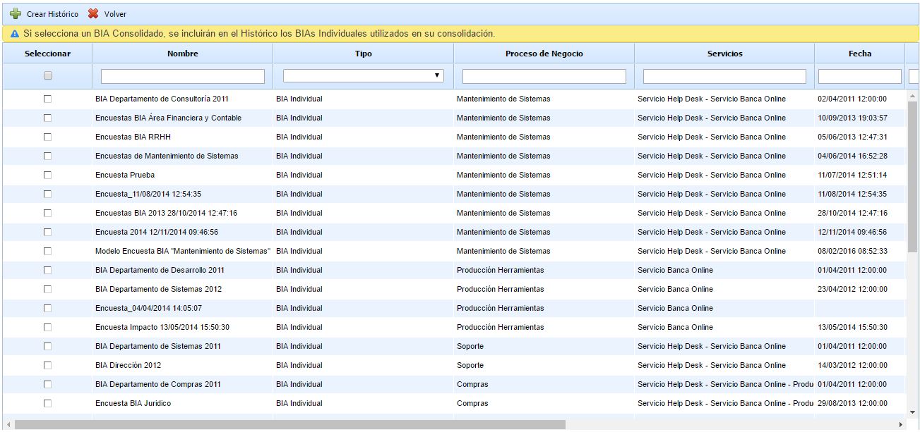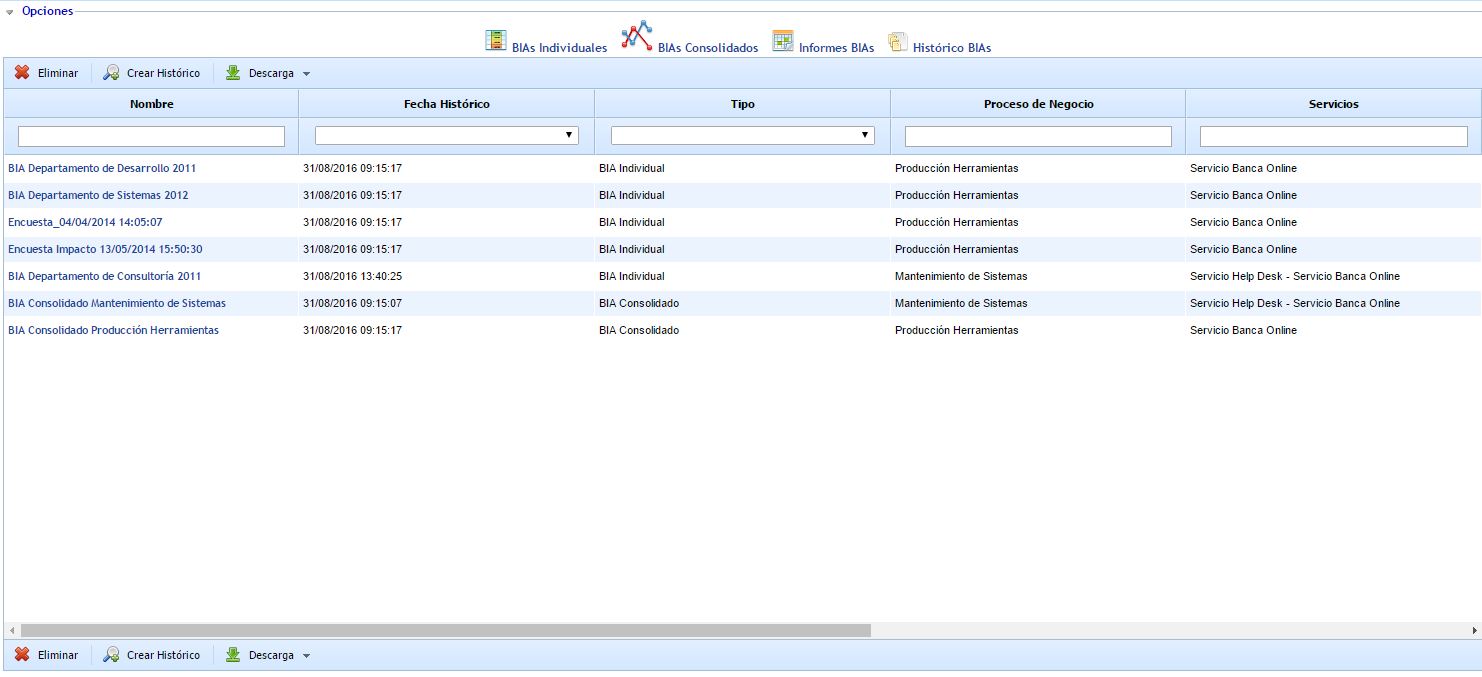 En la tabla principal de Históricos tenemos disponibles todos los registros de BIAs, pudiendo ver la fecha en que se realizó el histórico y el tipo de BIA (Individual ó Consolidado).