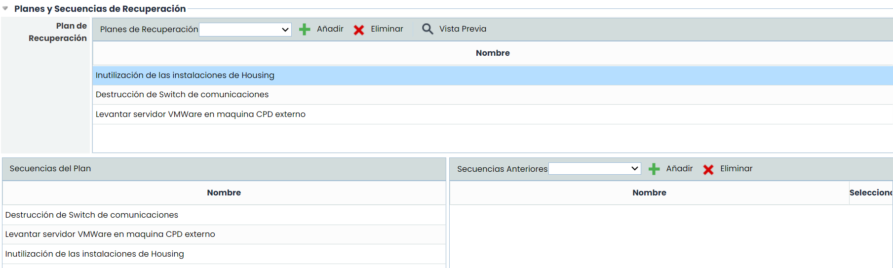 La opción de planes y secuencias de recuperación permiten asociar los diferentes planes de recuperación establecidos en el apartado 'Planes/Planes de Recuperación' para ejecutar la prueba y las secuencias de ejecución de la misma.