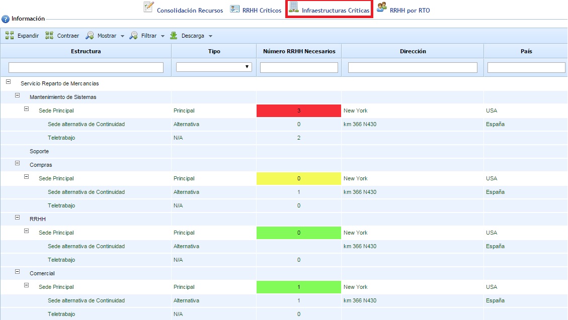 Las infraestructuras principales tienen asociado un número que representa el número de personas críticas que se deben trasladar a una ubicación alternativa o realizar labores de teletrabajo en caso de una contingencia de la infraestructura. Asociado a cada infraestructura principal se muestran las infraestructuras alternativas y la opción de Teletrabajo, permitiéndose definir para cada infraestructura alternativa el número de personas que se desplazarán a ella. Para el caso de Teletrabajo, el número que aparece es automático calculándose en función de las personas asociadas a la infraestructura principal que tienen definido como opción de trabajo en continuidad el teletrabajo.