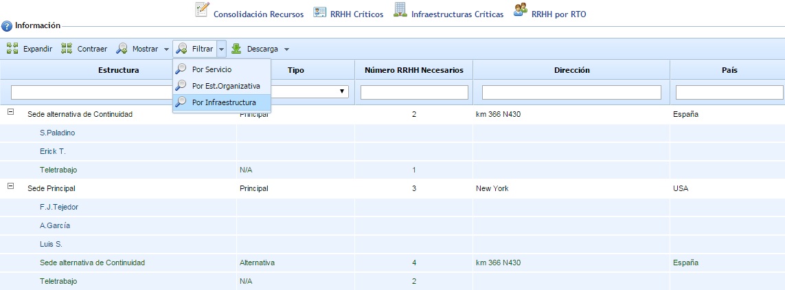 La opción "Filtrar" permite obtener diferentes vistas de la misma información. Aparte de la vista por defecto con el árbol de servicios y procesos, se permite visualizar la información teniendo en cuenta la Estructura Organizativa definida en el menú de Inicio o directamente el listado de infraestructuras de la organización con los empleados que se encuentran asociados a cada una. En la siguiente imagen se puede observar el resultado si seleccionarmos la opción "Filtrar - Por Infraestructura":