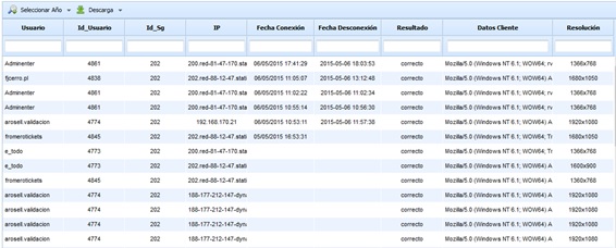 El presente apartado permite visualizar los difentes accesos que se han realizado sobre la plataforma, obteniendo información como el usuario, IP, fecha de conexión, datos del cliente, etc.