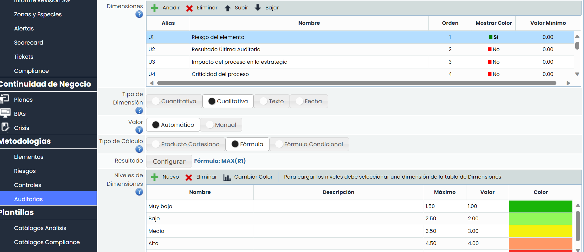 Metodología de Ejecución de Riesgos: Es posible definir qué dimensiones se van a evaluar para cada riesgo a auditar.