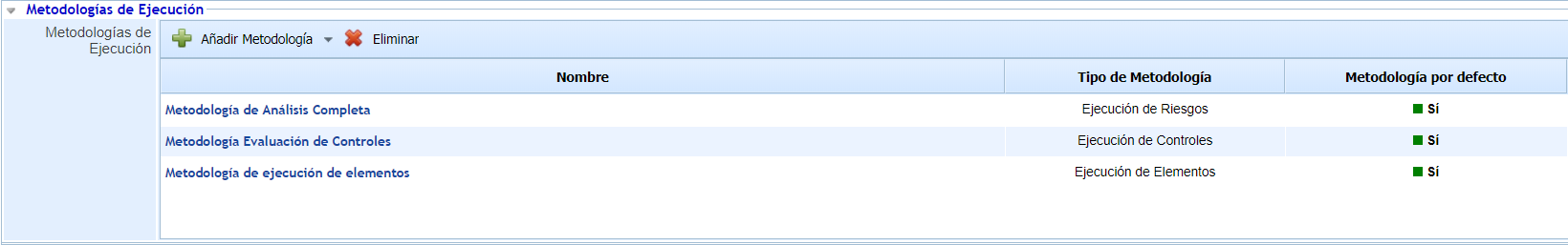 Es posible crear más de una metodología de ejecución de cada tipo, definiendo una por defecto. Los trabajos de auditoria que se creen, se les asignará la metodología por defecto, aunque se podrá modificar antes de comenzar la ejecución del mismo.