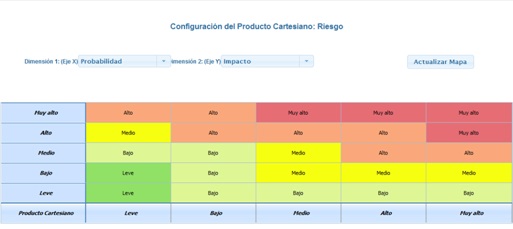 Producto Cartesiano: Permite establecer el cálculo de la dimensión seleccionada, en base a una matriz de dos dimensiones definidas en la opción 'Dimensiones'. Para ello se ha de seleccionar una dimensión en el 'Eje X' y otra dimensión en el 'Eje Y' y dar valores en función de los niveles establecidos.