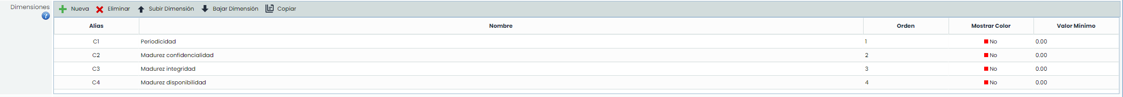 Dimensiones: Permite la configuración de las dimensiones a valorar en el análisis de riesgos para cada uno de los controles implantados. Se pueden crear y eliminar dimensiones, además de configurar el orden de aparición en la tabla correspondiente con los botones ‘Subir Dimensión’ y ‘Bajar Dimensión’.