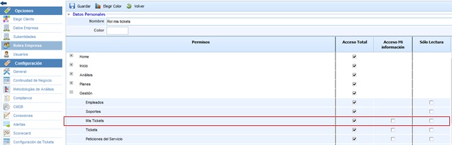 La siguiente opción se muestra si al usuario se le ha asignado un rol con acceso especifico al apartado de Mis Tickets, en Ajustes >Roles de Empresa , tal y como se muestra en la siguiente imagen: