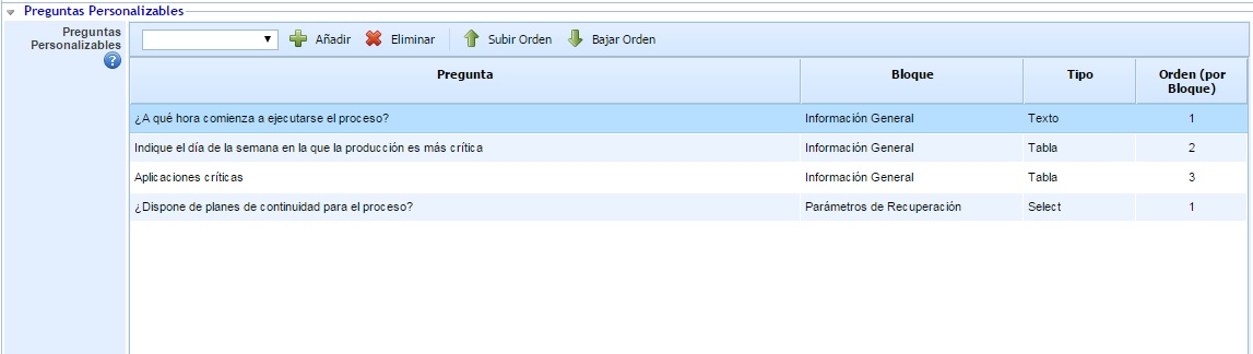 La tabla permite añadir las preguntas que se encuentran en la lista desplegable a través del botón "Añadir". Cada pregunta que se añade a la tabla se puede asociar a uno de los bloques del formulario BIA (columna "Bloque"), de forma que la pregunta queda ubicada en una sección concreta. Además, las preguntas personalizables que se encuentran dentro del mismo bloque se pueden ordenar a través de los botones "Subir Orden" y "Bajar Orden".