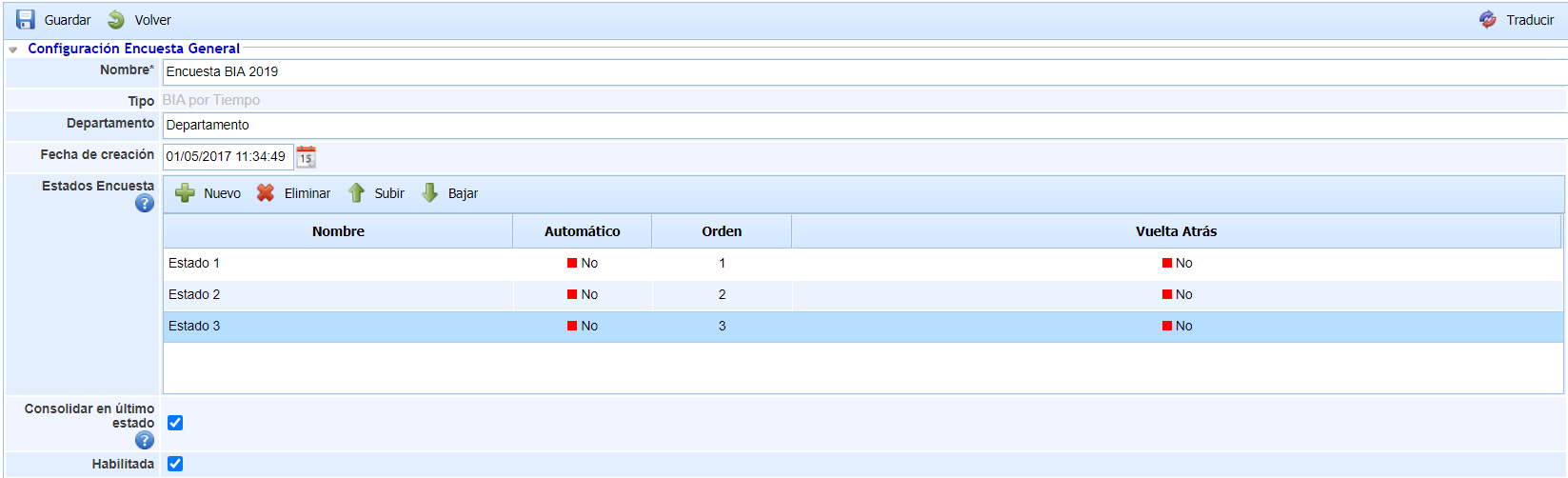 Si el estado permite que vuelva al estado anterior. Al marcar Sí, el responsable de completar la encuesta podrá devolverla al estado previo.