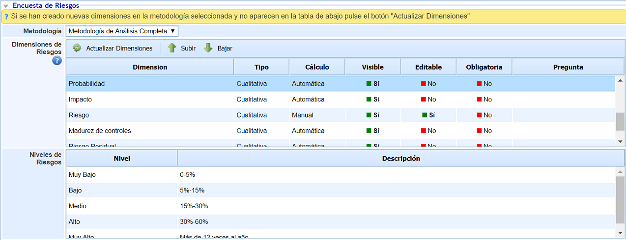 Obligatoria: Permite marcar como obligatoria una dimensión. Esto implica que esa dimensión deberá estar valorada para todos los riesgos, antes de Guardar o Pasar de Estado la encuesta. Este campo se puede poner a "Sí" en las dimensiones manuales.