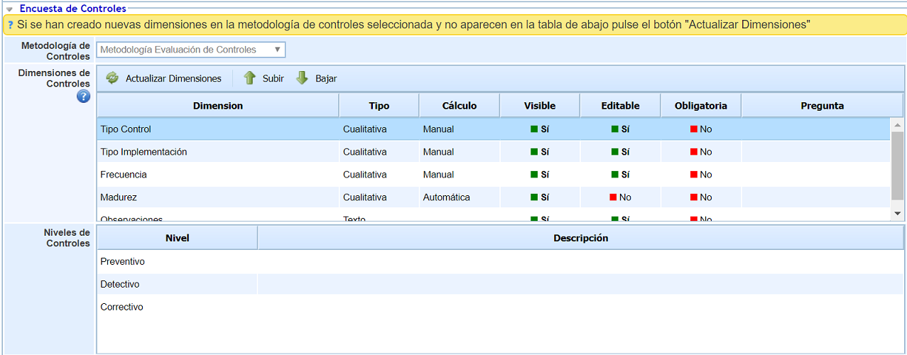 Actualizar Dimensiones: Permite actualizar el listado de dimensiones sobre las que realizar la evaluación de los controles, en el caso que el apartado de 'Ajustes/Metodologías de Análisis/Metodologías Controles' haya sido modificado posteriormente a la creación del modelo de encuesta.