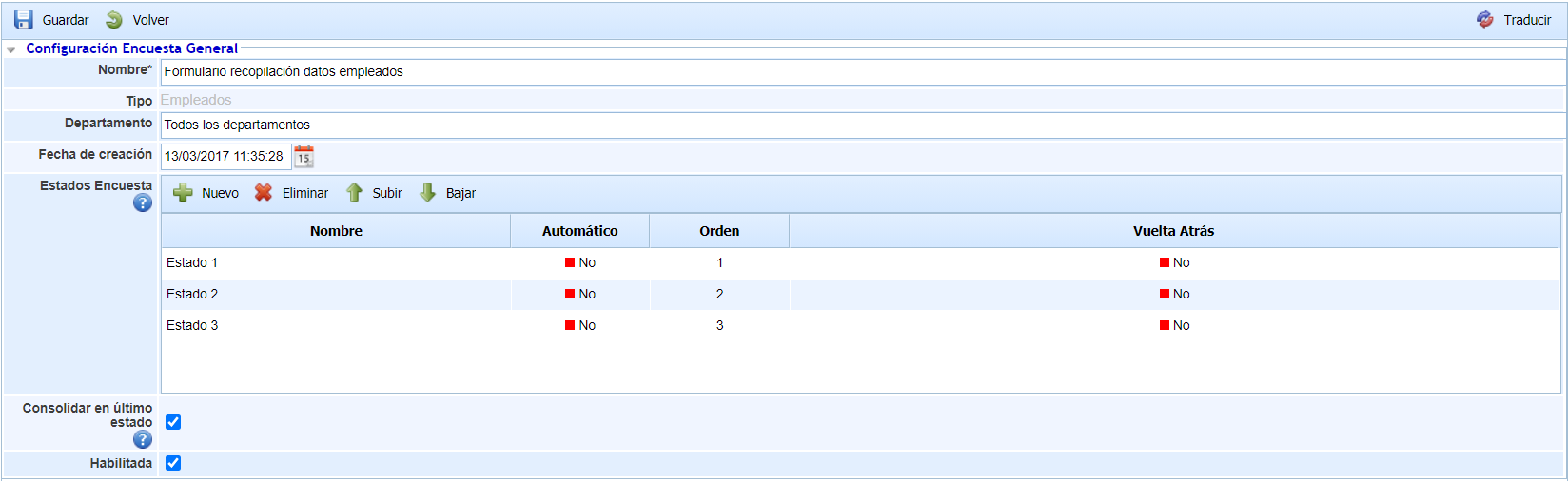 Si para el estado se permite que las encuestas pueden volver al estado anterior o no, a traveés del campo "Vuelta Atrás".