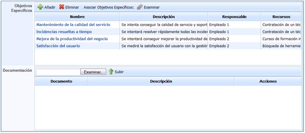 Documentación: Permite asociar cualquier tipo de documentación que pueda ser útil para conseguir o evidenciar el cumplimiento del objetivo de negocio generado.