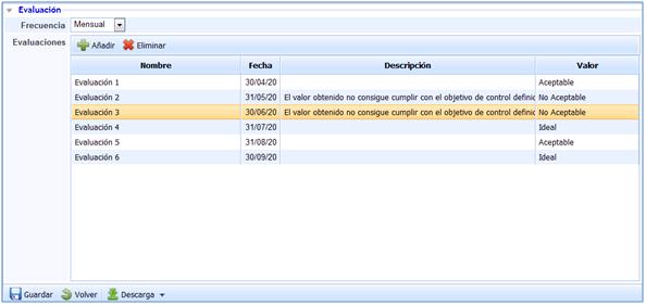 Para establecer el registro de evaluación del objetivo de negocio GlobalSuite nos proporciona las siguientes opciones. -Añadir: Permite generar un nuevo registro de evaluación. -Eliminar: Permite eliminar un registro de evaluación generado de forma previa.