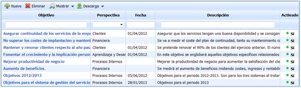 La pantalla principal de la opción objetivos de negocio muestra el listado de todos los objetivos que han sido definidos.