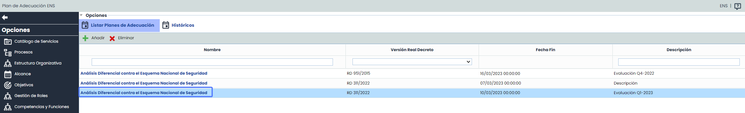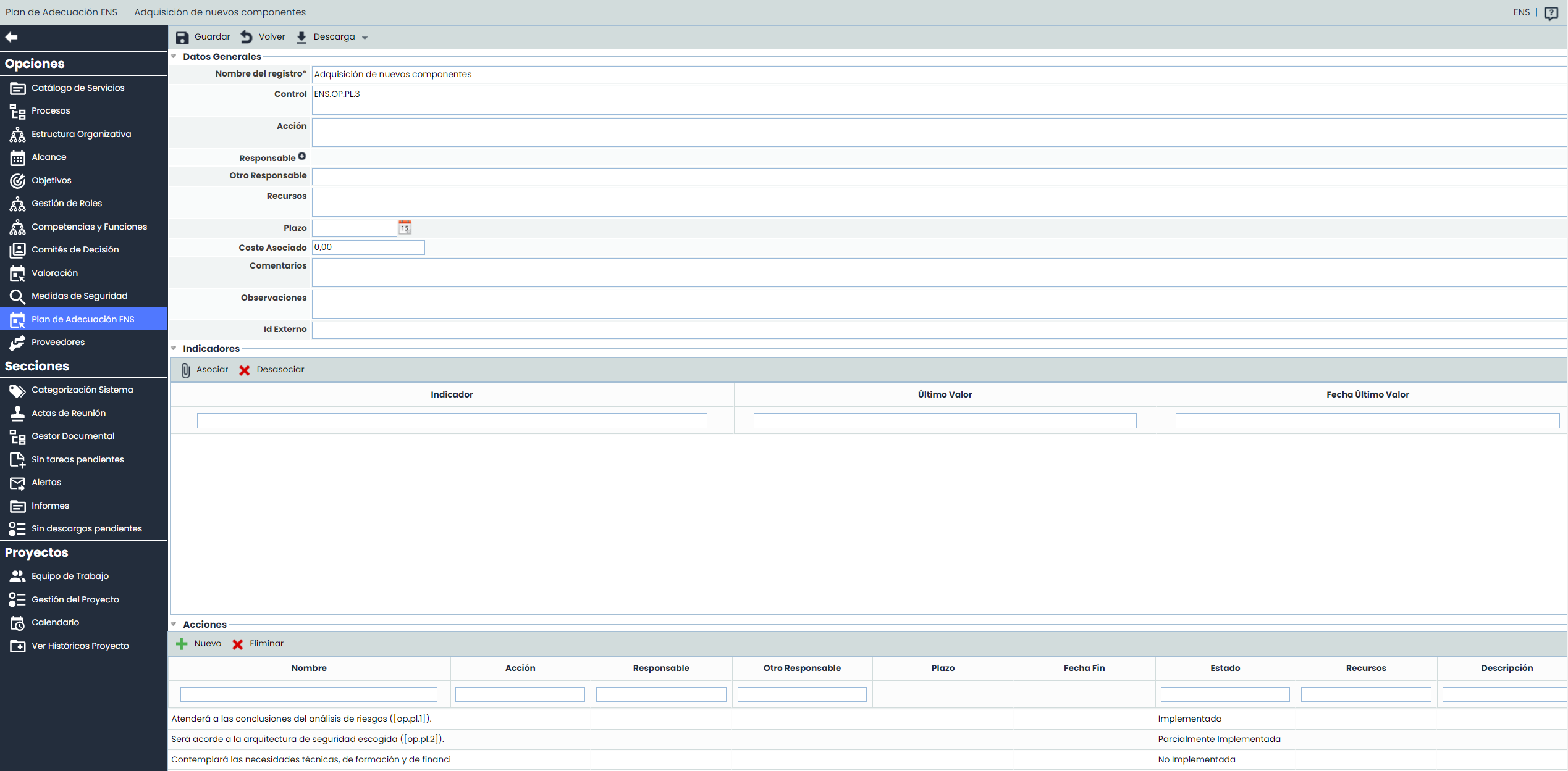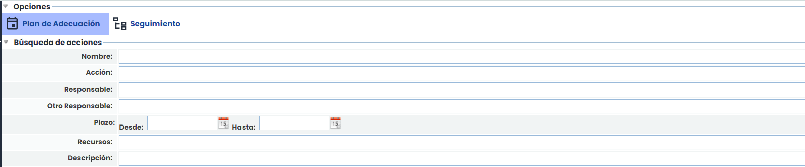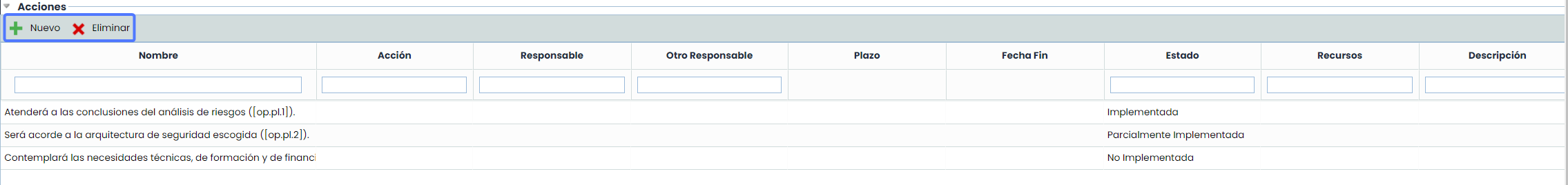 Se visualizarán todas las acciones que no estén totalmente implementadas y se podrán eliminar o añadir nuevas al Plan.