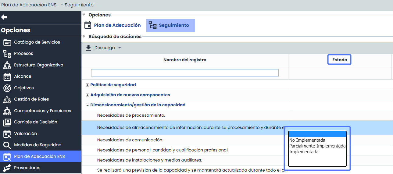 Estado: Campo selector editable con los posibles niveles de implantación de las acciones. Editable sólo a nivel de acciones. Las opciones de este campo se podrán configurar en la opción Ajustes> Metodologías > Elementos