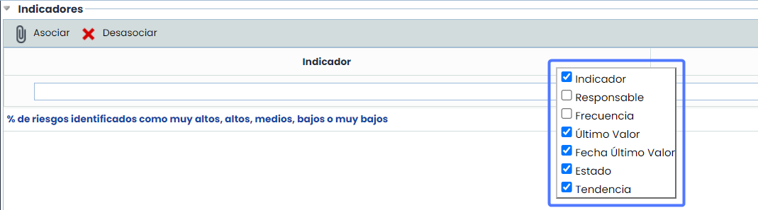 En caso de tener la licencia GlobalSuite® Balanced ScoreCard se podrán asociar y desasociar indicadores al control. Al hacer click en "Asociar Indicador" se abrirá una ventana con el listado de indicadores existentes, los cuales se podrán asociar al control.