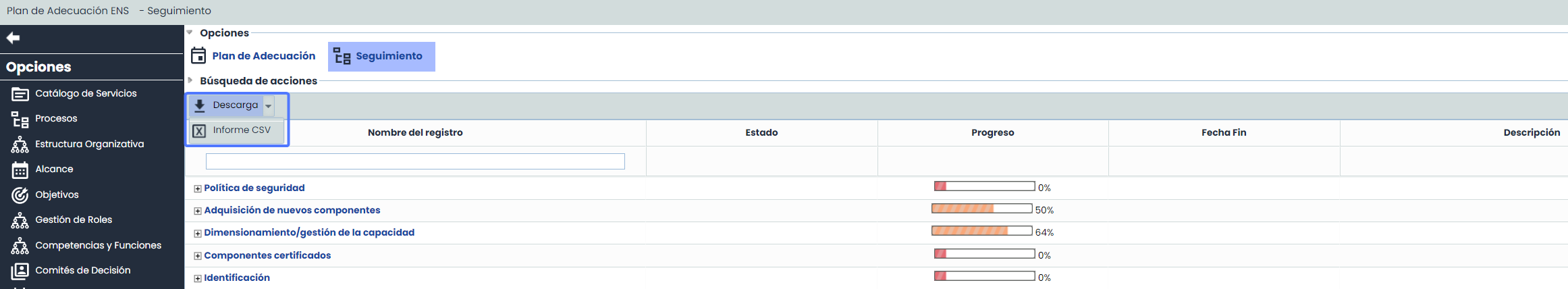 Informe CSV: Esta opción permite generar un Informe CSV de los controles y acciones a implementar para permitir una mejor revisión y análisis de los datos. Además, en caso de tener filtros aplicados en la vista, se descargarán en el Informe los registros que coincidan con los mismos.