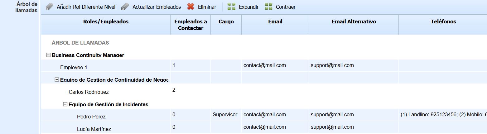 Árbol de llamadas: Esta tabla permite elaborar un árbol de llamadas asociado al Plan de Recuperación. En la tabla se muestra de manera jerárquica los empleados responsables de realizar la comunicación, de forma que cada empleado debe avisar a los responsables que se encuentran en un nivel inferior al que se encuentran. Junto a cada empleado, se indica el número de empleados a contactar, el cargo del empleado, su email principal y alternativo, así como sus teléfonos (todos estos datos corresponden a los indicados en la opción 'Empleados' del menú Gestión).
