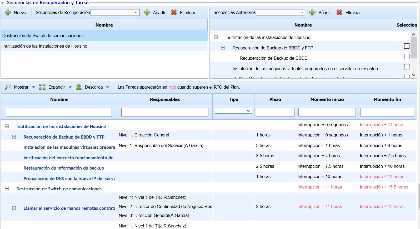 Esta sección permite al usuario establecer la secuencia de actuación del Plan de Recuperación ante un desastre.