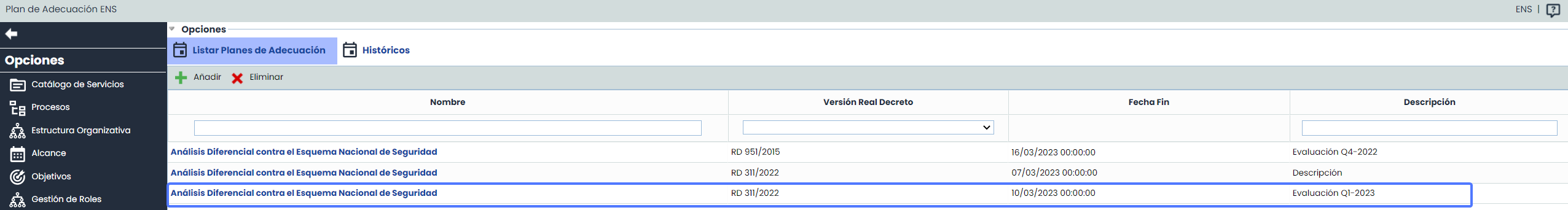 Al acceder a la opción, la herramienta mostrará un listado los Planes de Adecuación del ENS creados.