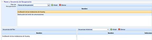 La opción de planes y secuencias de recuperación permiten asociar los diferentes planes de recuperación establecidos en el apartado 'Planes/Planes de Recuperación' para gestionar la crisis y las secuencias de ejecución de la misma.