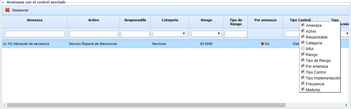 Muestra el listado de amenazas de la tabla superior a las que está asociado el control, incluyendo el nivel de riesgo y su tipo. Para desasociar la amenaza al control se ha de seleccionar la fila o filas deseadas y pulsar el botón ‘Desasociar’.