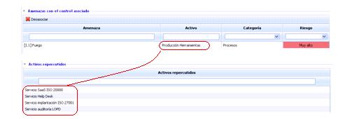 Muestra el listado de activos que se van a ver afectados de manera indirecta por el control. Los activos mostrados son aquellos de los que depende el/los activos identificados en el apartado anterior ‘Amenazas con el control asociado’. Las dependencias se definen en el apartado ‘Análisis/Inventario de Activos’.