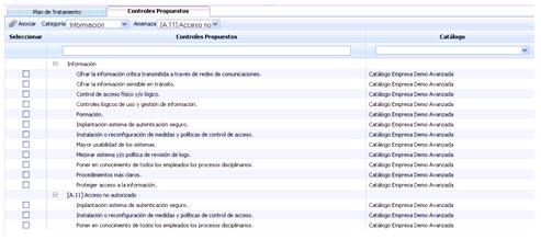 Amenaza: Permite mostrar el listado de controles propuestos por amenazas. El listado de controles puede definirse en ‘Ajustes/Catálogos Análisis’.