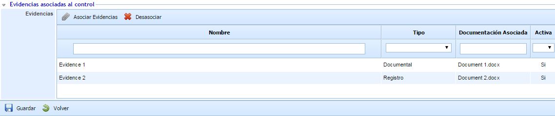 Asociar/Desasociar: Permite asociar/desasociar uno o varios controles de la tabla inferior a los riesgos deseados. Para ello se he de seleccionar el checkbox del riesgo, seleccionar el checkbox del control de la tabla inferior y pulsar ‘Asociar’/‘Desasociar’.