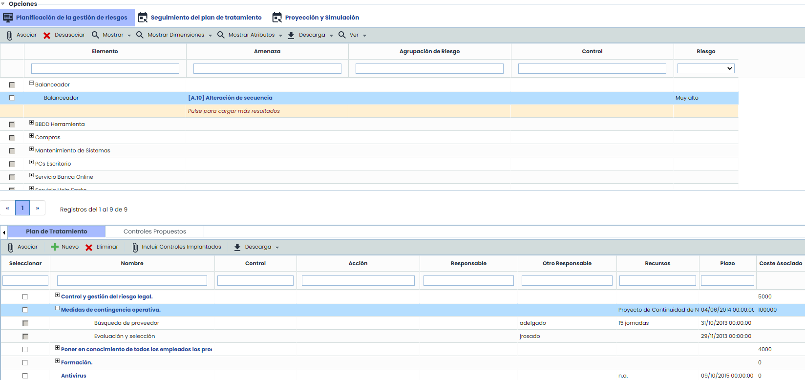 En la parte inferior se muestra el listado de acciones que se han definido para mitigar las amenazas que superan el NRA listadas en la tabla superior. Las opciones que su pueden realizar sobre la tabla son: