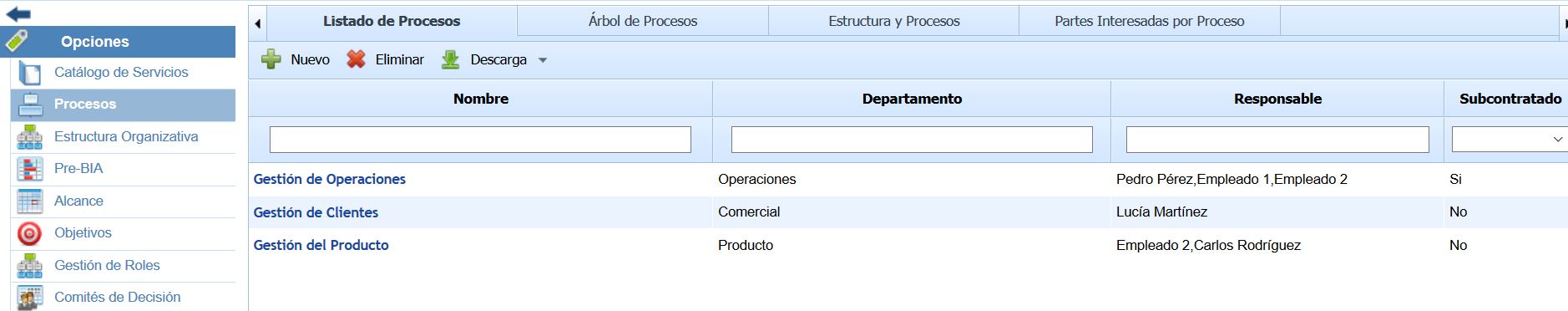 El botón ‘Descarga’ permite descargar el listado de procesos, partes interesadas y requisitos en formato editable (.xlsx) o en formato PDF.