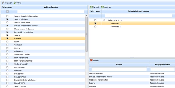 Propagar: Una vez seleccionados los activos deseados permite propagar los mismos y sus dependencias a las subentidades seleccionadas.
