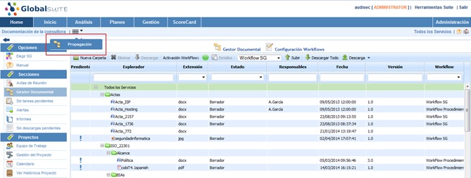 La presente opción permite la propagar los documentos almacenados en el gestor documental de la empresa matriz a las subentidades que dependen de esta.