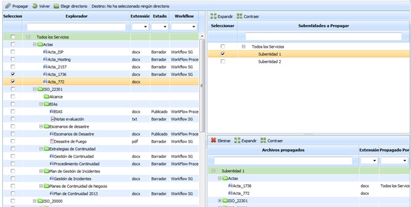 Propagar: Una vez seleccionados los documentos deseados permite propagar los mismos a las subentidades seleccionadas.