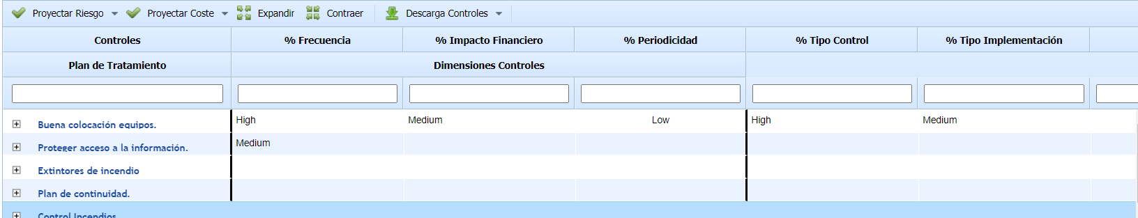 - Valor asociado al control: Indica el coste económico que supone a la empresa la implantación del control. Este valor se define en el aparatado de ‘Planificación de la Gestión de Riesgos’