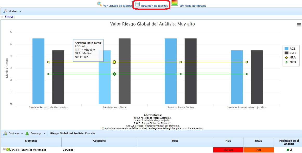 NOTA: Todos los valores de riesgos que aparecen en la gráfica (RGE, RRGE, NRA, NRO y Riesgo Global del Análisis) se establecen en función de los criterios definidos en la opción 'Análisis de Riesgos - Información General'.