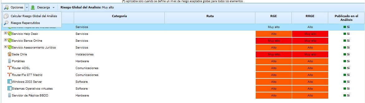 Opciones - Calcular Riesgo Global del Análisis: Realiza el cálculo del Riesgo Global para el análisis de riesgos. El criterio que se utiliza para obtener el Riesgo Global por Análisis se define en el apartado 'Análisis de Riesgos - Información General' explicado en secciones anteriores.