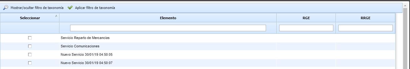 Por lo tanto hay que seleccionar en el botón "Mostrar" la opción de "Seleccionar elementos" para marcar cuáles se quieren mostrar. En la ventana emergente se puede filtrar por la taxonomía, para obtener los servicios que cumplan que alguna de sus amenazas tenga alguno de esos riesgos asociado.