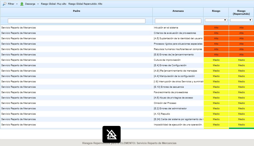 Opciones - Riesgos Repercutidos: Permite visualizar las amenazas repercutidas de un elemento concreto. Las amenazas repercutidas están formadas por las amenazas del propio elemento más las amenazas de los elementos dependientes (en función de las dependencias establecidas en el apartado 'Inventario').