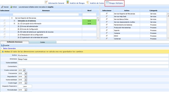 La opción de riesgos múltiples ofrece la posibilidad de generar una amenaza específica que englobe varias amenazas definidas en el aparato de ‘Análisis de Riesgos’.