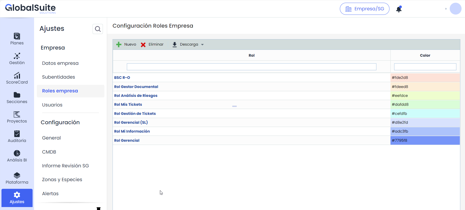 La opción de Roles ofrece la posibilidad al usuario de gestionar el acceso por perfiles a los diferentes módulos de la plataforma.