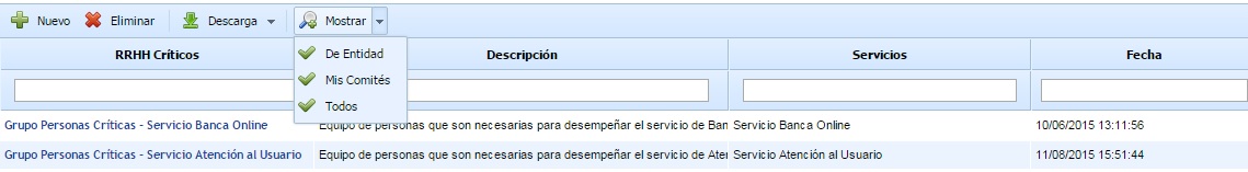 Todos: Muestra todos los RRHH Críticos definidos, tanto de la entidad con la que se está trabajando como de las entidades que se encuentran por debajo.