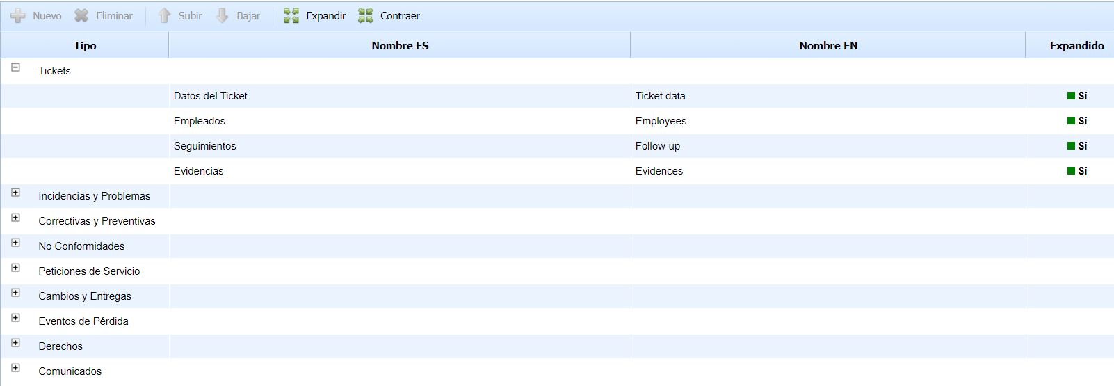 Esta opción nos permite crear y editar las secciones para cada uno de los Tickets. Dando con esto la posibilidad de agrupar los diferentes campos del ticket en diferentes módulos.
