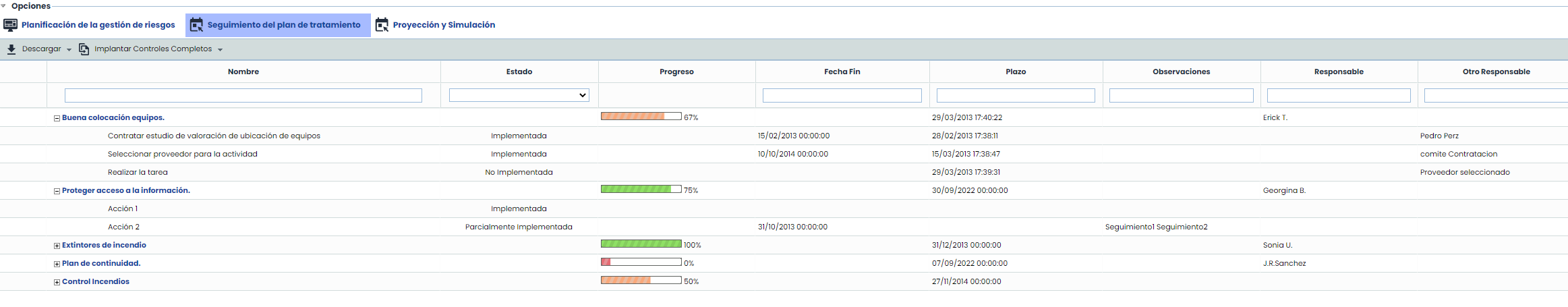 La opción permite realizar un seguimiento del grado de avance de implantación de los controles definido en el apartado desarrollado en el punto anterior.
