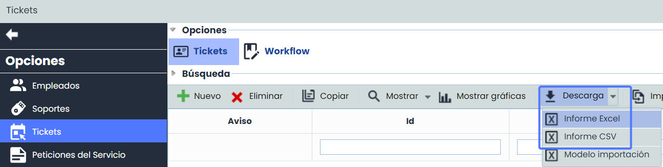 Descarga: Permite descargar el listado de Tickets representados en formato CSV. Este Informe estará disponible en Descargas Pendientes.