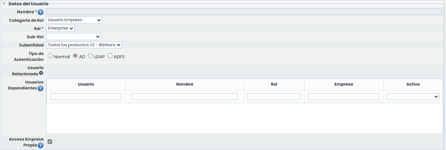 Acceso Empresa Propia: Permite marcar si se permite el acceso del usuario a su propia empresa, o por el contrario, solo tendrá acceso a las entidades con las que se ha realizado y que se visualizan en el apartado anterior de "Usuarios Dependientes".