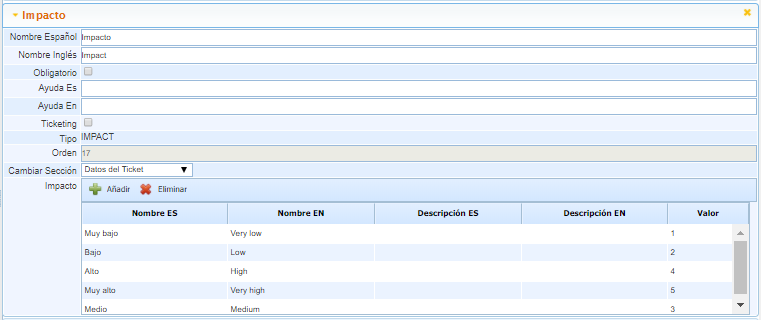 Permite añadir una tabla de registros, estos registros estarán relacionado con un plan de gestión de incidentes. Nos permitirá asociar al ticket una serie de impactos y niveles.