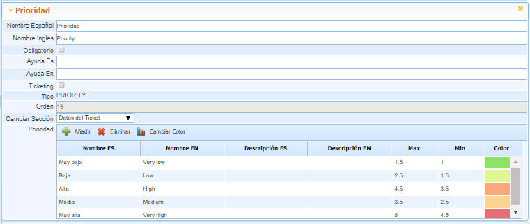 Prioridad: Tabla de configuración de las diferentes opciones del campo, con su rango máximo y mínimo de valoración y las descripciones en cada caso.